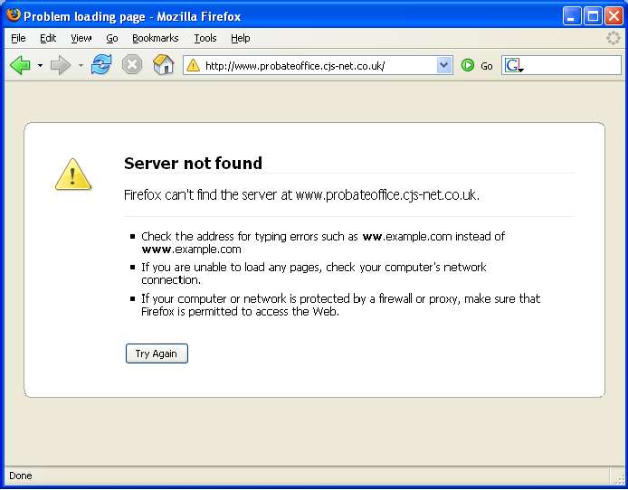 First, the contact information. the scammer says to email him at probateoffice@probateoffice.cjs-net.co.uk So we type in the domain portion (adding www.) in our browser, to look at www.probateoffice.cjs-net.co.uk. Surprise, surprise, there is no website there (see the screenshot below); it doesn't exist.